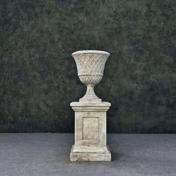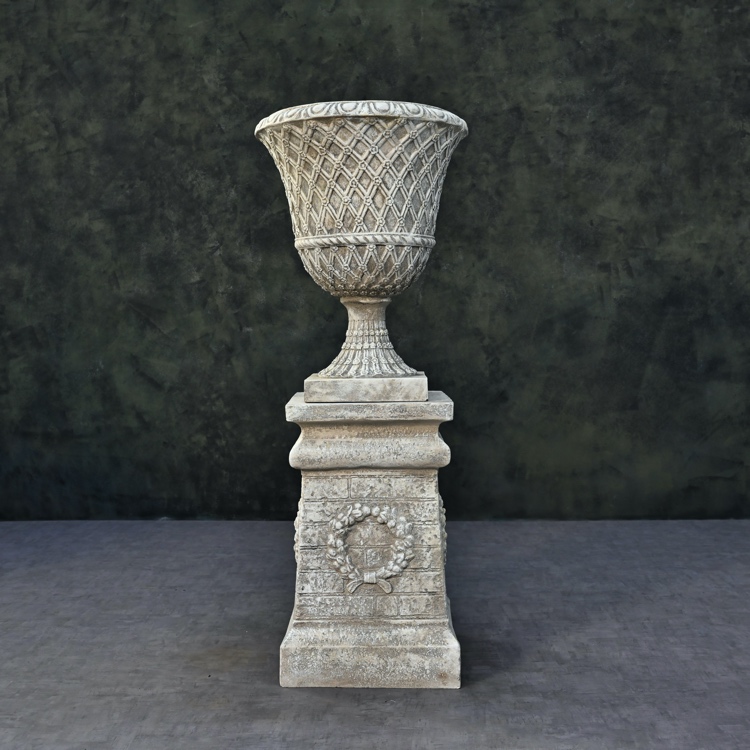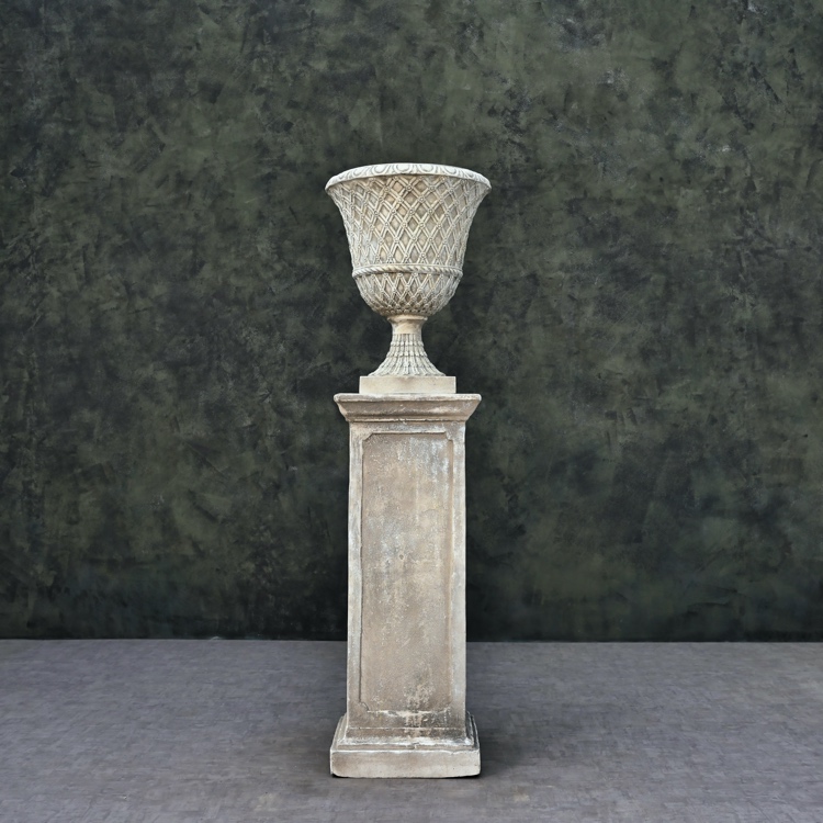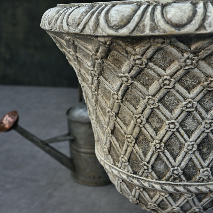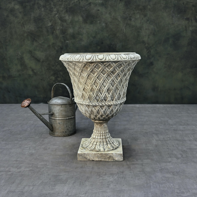 Introducing the Palmbrokers Stone Painted Lacock Abbey Lattice Urns – the epitome of classic elegance for weddings, film productions, and noteworthy occasions.